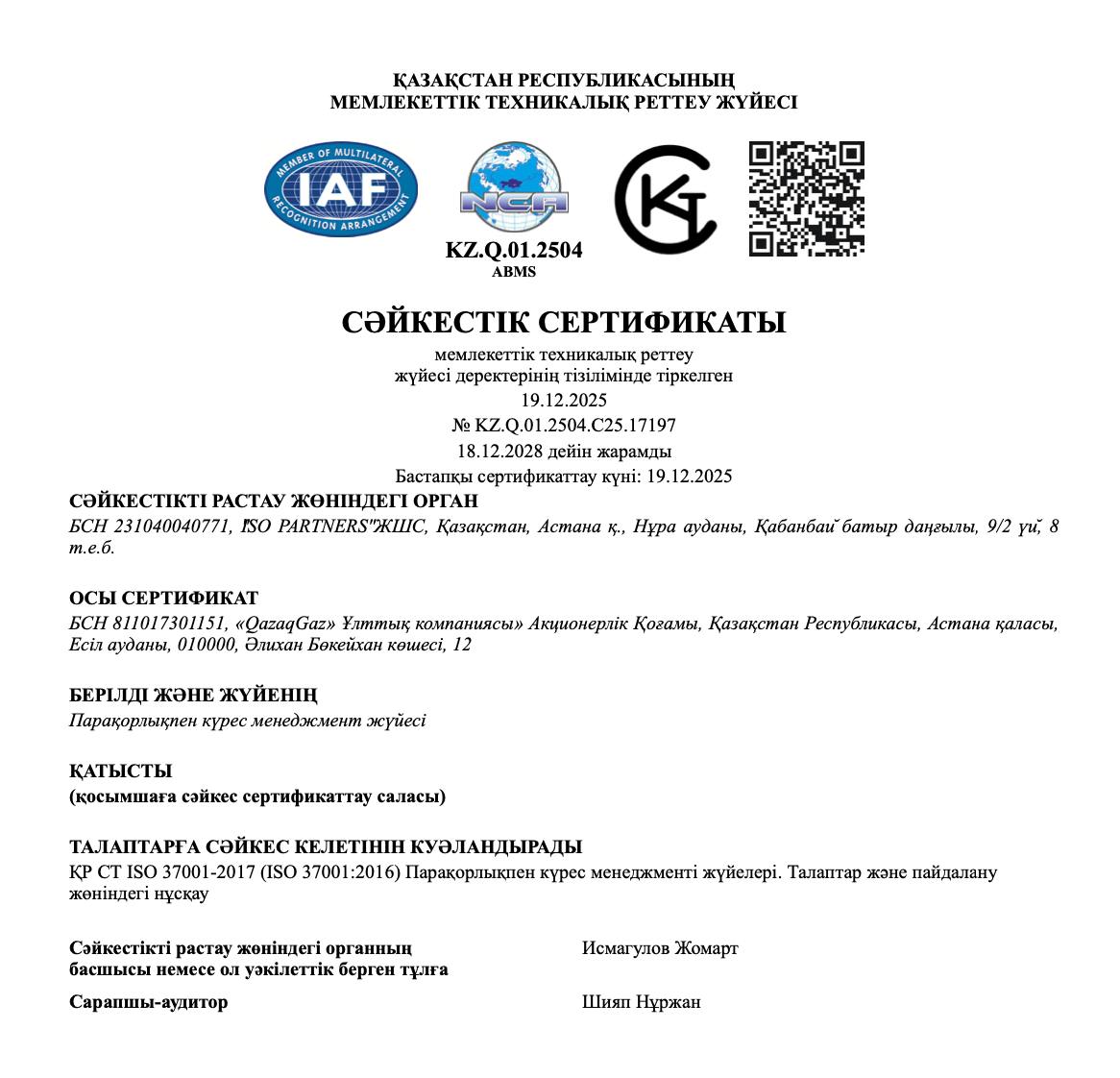 АО «НК «QazaqGaz» успешно прошло два этапа внешнего аудита системы менеджмента борьбы со взяточничеством и по их итогам получило сертификат соответствия СТ РК ISO 37001-2017 (ISO 37001:2016).