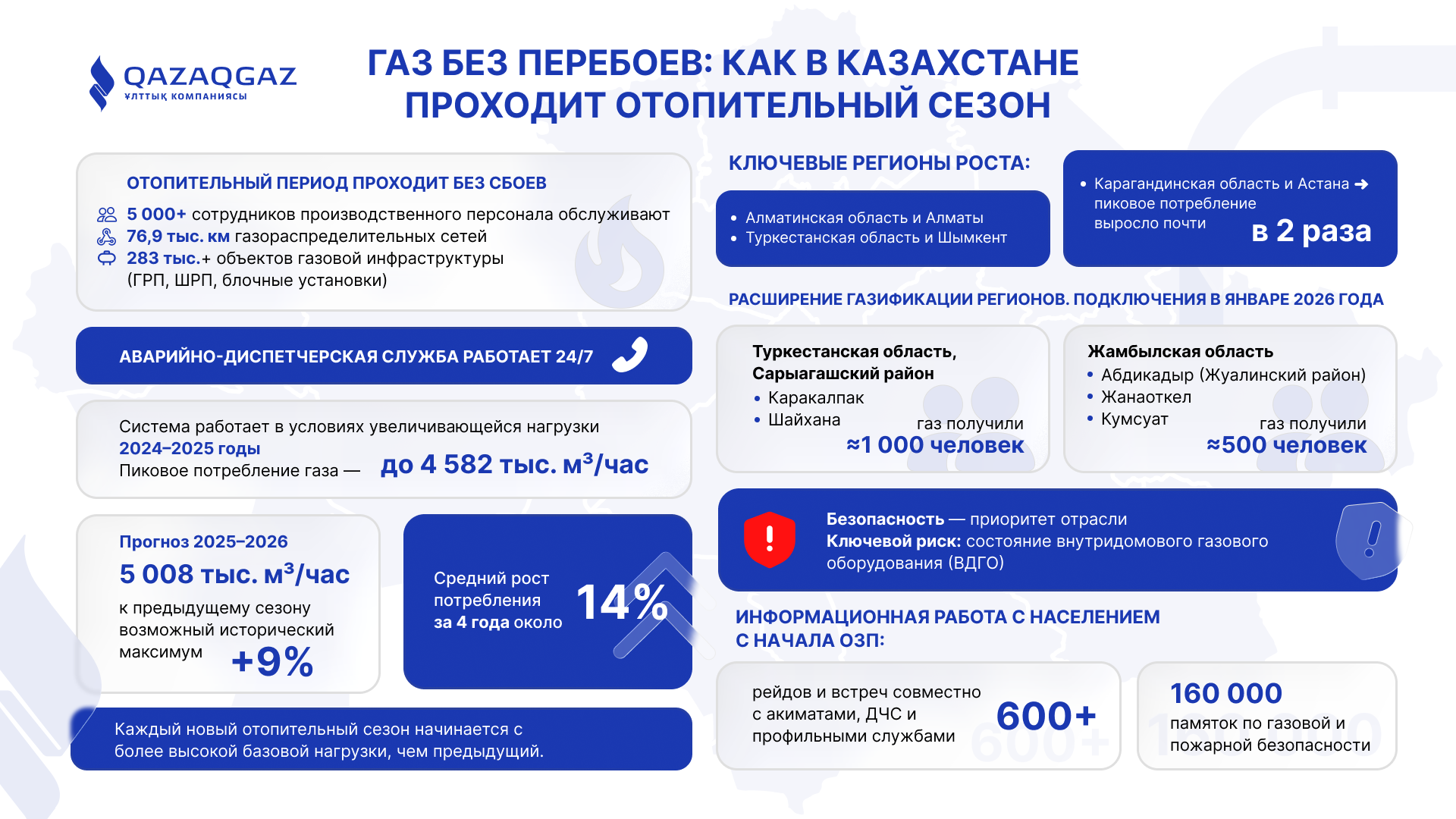 Биылғы жылыту маусымында елді газбен қамтамасыз ету тұрақты түрде жүргізілуде. Жүйенің сыр бермеуіне тәулік бойы жұмыс істейтін апаттық-диспетчерлік қызмет мамандары, диспетчерлер және тағы басқа өндіріс қызметкерлері жауапты. Олардың жауапкершілігінде 76,9 мың шақырым газ тарату желісі және 283 мыңнан астам газ инфрақұрылым нысандары бар.